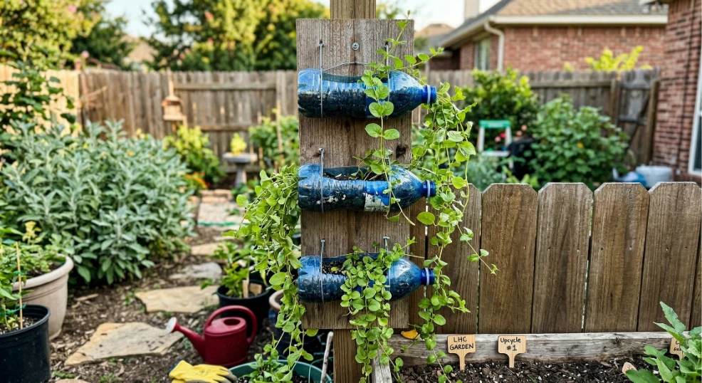 A vertical wall of upcycled blue plastic bottles turns zero-cost kitchen waste into a colorful, trailing garden display that earns double-takes. Collect 8 to 12 clean plastic bottles of similar size, cut an opening on one flat side of each, and punch a drainage hole on the opposite side. Mount them to a wooden fence board using zip ties or wire, staggering heights every 6 inches for a dynamic arrangement. Fill each bottle with lightweight potting mix and tuck in a trailing vine like sweet potato vine or creeping jenny for instant lush effect.