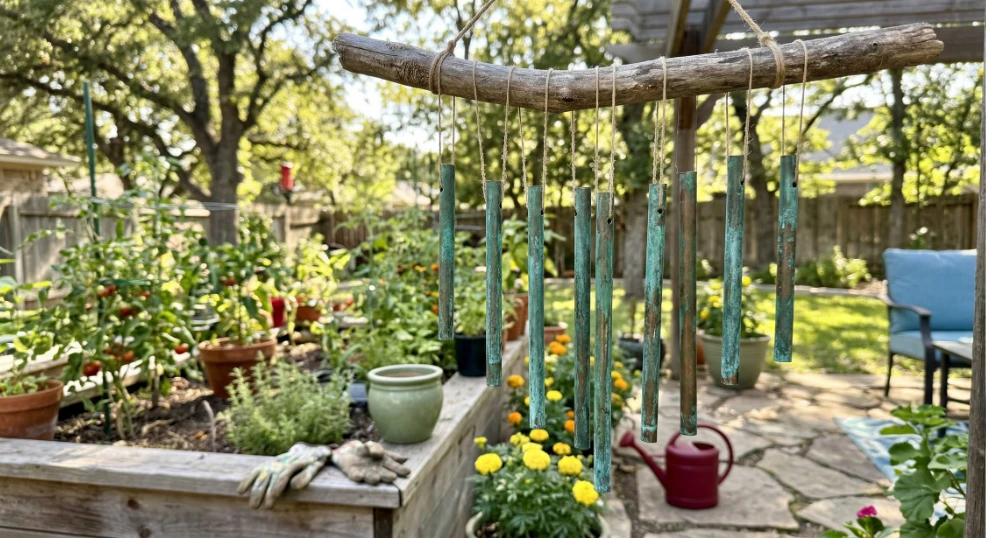 Sun-warmed copper tubes catching afternoon light bring that handmade, storytelling charm that makes a garden feel genuinely lived-in and loved. Gather scrap copper pipe pieces in varying lengths, from about 4 inches to 12 inches, and sand them lightly to reveal the warm metal underneath. Drill a small hole at the top of each tube, thread them onto a length of jute twine, and knot each piece at staggered heights. Tie the bundle to a weathered branch at least 18 inches wide and hang it from a sturdy porch hook or tree limb where the breeze can do its thing.