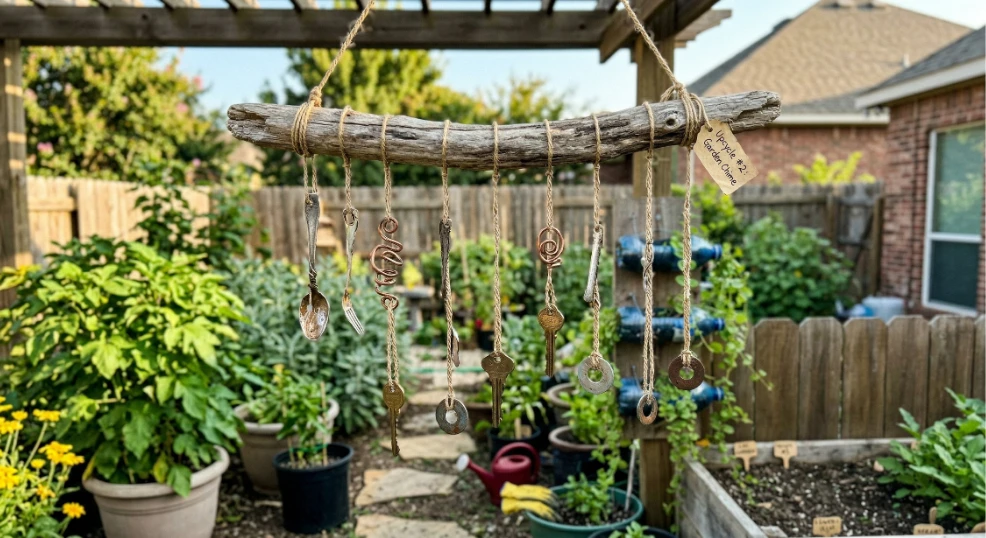 Free beach or riverside driftwood strung with scrap metal pieces creates a breezy, sculptural mobile that feels both rustic and artsy without spending a dime. Find a straight driftwood branch about 24 inches long and sand any rough or splintered edges smooth. Collect scrap metal odds and ends such as old keys, bottle caps, hardware store washers, and bent wire, and knot each piece to lengths of jute twine ranging from 6 to 18 inches. Tie the twine pieces along the branch at uneven intervals, then hang the whole mobile from a tree branch or pergola beam where wind will animate it naturally.