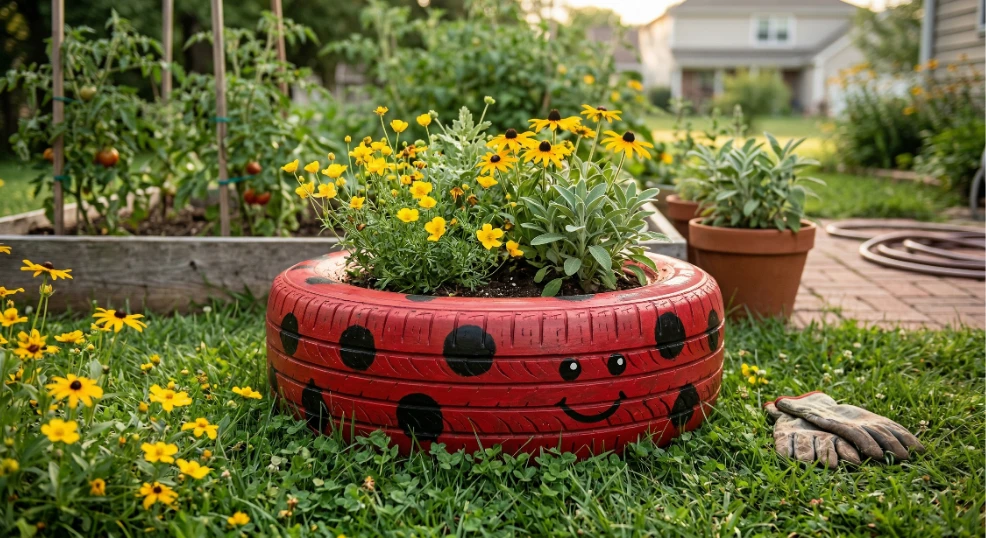 A rescued car tire painted into a smiling ladybug is the kind of bold, cheerful upcycle that makes your front yard the most talked-about one on the block. Clean and dry a standard passenger tire thoroughly, then apply two coats of bright red exterior spray paint and let it cure for 24 hours. Use black exterior paint to add large round spots, a dividing center stripe, and a curved smile on the front face. Place the finished tire on a sunny patch of lawn, fill the interior with potting soil, and plant compact marigolds or petunias for a vibrant, budget-friendly flower bed.
