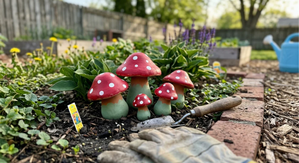 Turned terracotta pots painted as oversized fairy mushrooms bring an instant playful focal point that draws every guest straight to that garden corner. Flip a standard 6-inch pot upside down for the stem and use a wider 10-inch saucer as the cap, securing them with waterproof outdoor adhesive. Paint the cap ruby red with a white base coat, then add white polka dots using a round sponge or the eraser end of a pencil. Arrange three mushrooms of varying sizes together in a garden bed, spacing them about 8 inches apart for a clustered fairy-tale grouping.