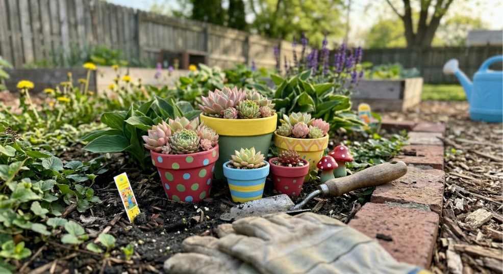 A curated corner of painted pots packed with hardy succulents and tiny toadstool props builds an enchanted miniature world that grows more charming with every season. Choose three to five terracotta pots in graduated sizes, paint each one a different accent color from sage green to sky blue, and seal with outdoor Mod Podge. Arrange them on a flat garden stone or wooden pallet slice, planting a different rosette succulent variety in each pot for textural contrast. Tuck ceramic or resin toadstool figurines between the pots to complete the fairy-tale scene without any ongoing cost.