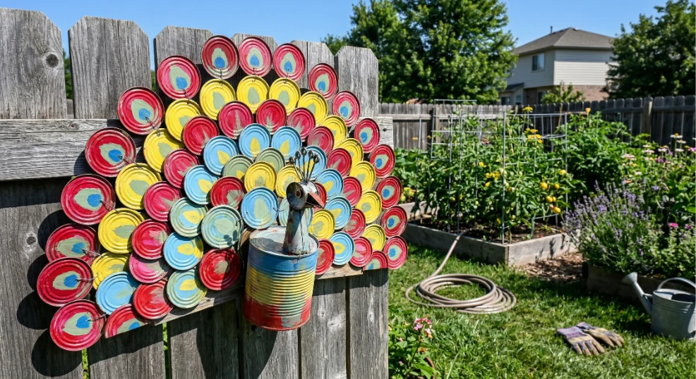 Repurposed tins and painted lids assembled into a fan-tailed peacock deliver shimmering, sun-catching art from materials most people toss every week. Save 20 to 30 tin lids from canned goods and paint each one a different jewel tone, from teal to cobalt to sunny yellow, using rust-resistant spray paint. Arrange the lids in a fan shape on a flat piece of plywood cut into a peacock body silhouette, attaching each lid with a short screw through the center. Mount the finished piece on a garden fence or stake it upright in a flower bed where sunlight will bounce off the metallic surfaces throughout the day.