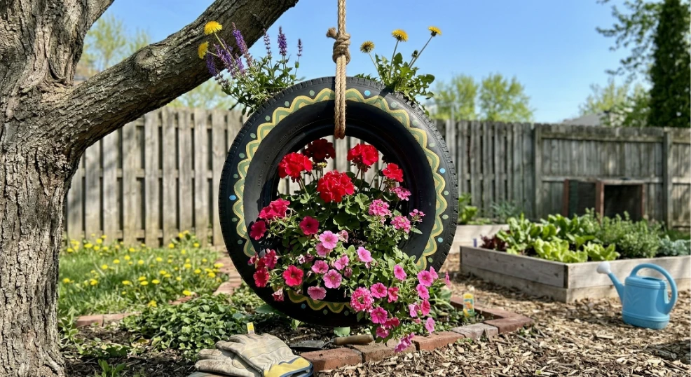 A single tire painted in a bold accent color and suspended from a tree branch becomes a swinging vertical planter that saves ground space and adds serious visual drama. Clean a standard tire, coat it in two layers of bright exterior paint in ruby red or sky blue, and allow it to cure for a full day. Thread a length of thick rope or chain through the tire center and knot it securely on both sides of the rim, leaving about 2 feet of rope above for hanging. Fill the interior with potting soil mixed with perlite for drainage, plant trailing red geraniums or fuchsia blooms, and hang from a sturdy tree limb at least 6 feet off the ground.