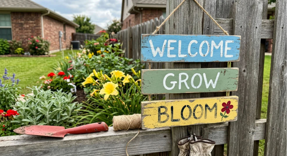 A row of weathered wood signs with hand-painted lettering transforms a plain garden entry into a warm, story-rich welcome that only costs the price of a few craft paints. Source three untreated pine boards cut to roughly 6 by 24 inches each, then sand all edges and distress the surface lightly with coarse sandpaper for an instant aged look. Paint each board a different neutral or soft color, then letter words like “Welcome,” “Grow,” and “Bloom” in contrasting paint using a basic stencil or freehand brush. Hang the trio vertically or horizontally from a garden gate, fence post, or shepherd’s hook using jute rope at staggered heights.
