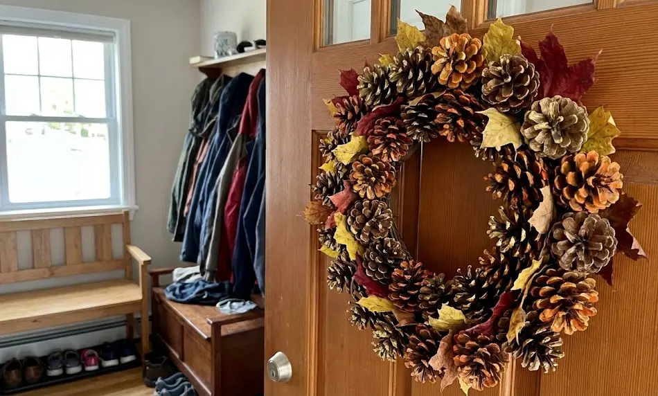 Combine painted or natural pine cones with preserved autumn leaves on a wreath form. The combination of textures—smooth leaves and rough pine cones—creates visual interest that flat wreaths just can’t match.