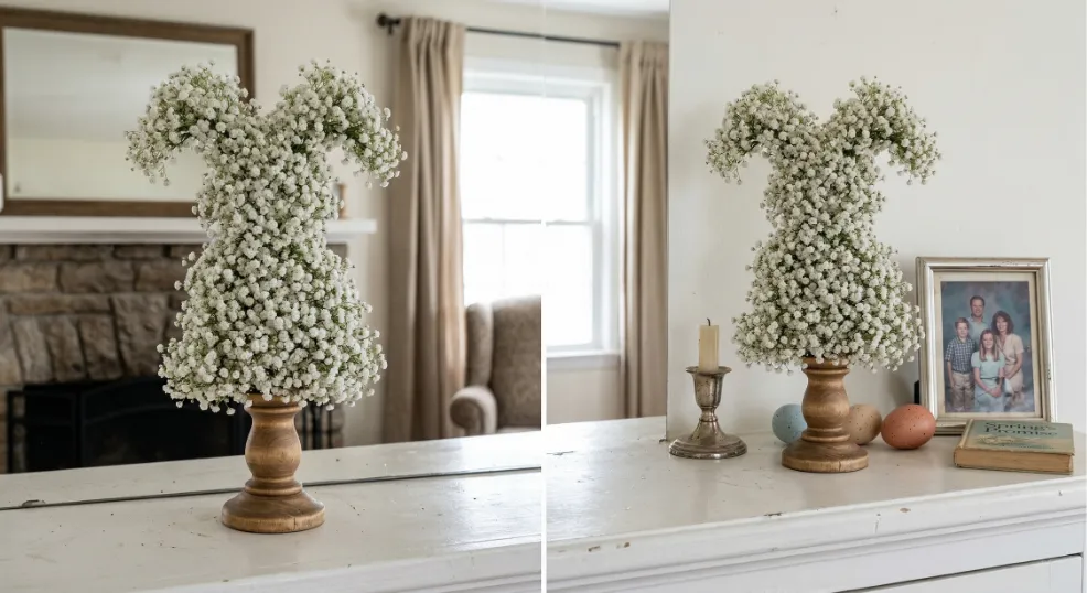 A bunny silhouette sculpted entirely from baby’s breath sprigs is a charming, zero-cost mantel accent that kids and adults both love. Wire 10 to 12 small baby’s breath clusters into a bunny body outline using floral wire, shaping floppy ears that stand about 12 inches tall. Place the finished form on a small wooden Easter egg stand or a folded piece of burlap for a finished display.