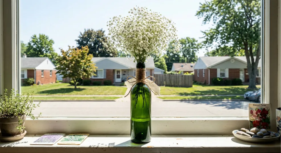 A tall recycled wine bottle stuffed with overflowing baby’s breath creates an airy, ethereal Easter accent that beginners can assemble in minutes. Rinse and dry a clean wine bottle, then tie a 12-inch piece of ribbon or twine around the neck for a finished touch. Fill the bottle with water and arrange 15 to 20 baby’s breath stems so they fan out naturally 6 to 8 inches above the bottle opening.