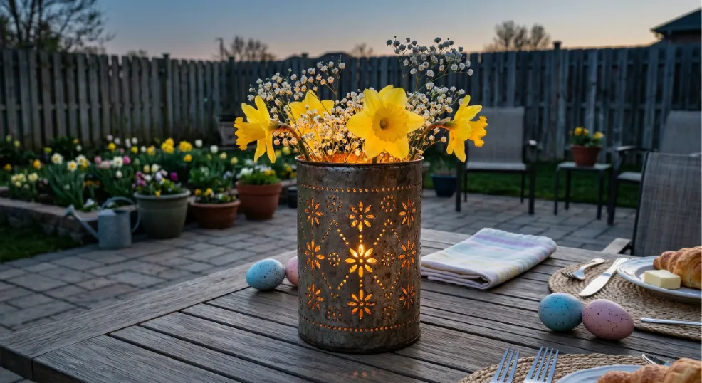 Daffodils placed inside a punched tin lantern glow with warm Easter magic for evening brunches, and you can make the lantern itself from recyclables. Punch a decorative pattern of small holes into a clean tin can using a nail and hammer, then place a battery-operated tea light inside for safe, cord-free glow. Arrange 3 to 4 short-stemmed daffodils and a few baby’s breath sprigs in a small water-filled cup inside the lantern so blooms peek through the punched panels.