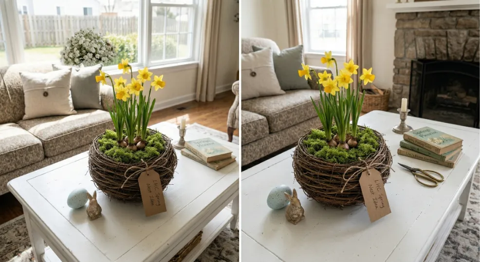Daffodils nestled inside a faux grapevine bird’s nest pull off Easter’s rebirth theme beautifully on a coffee table or entryway console. Line a grapevine nest sphere (available at craft stores for under $3) with a thin layer of green sheet moss. Poke 4 to 5 daffodil stems through the moss base and scatter a few baby’s breath wisps around the flowers for a brunch-ready display that takes under 10 minutes.