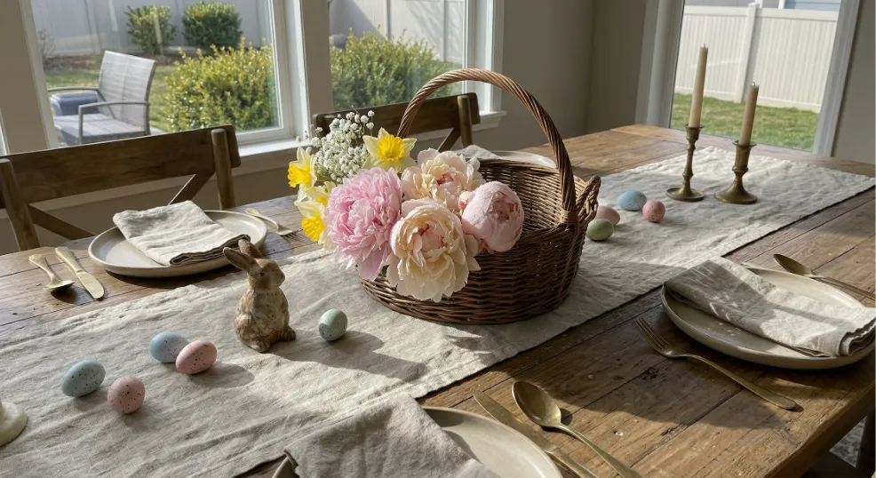 A shallow glass bowl overflowing with grocery-store peonies is the fastest way to bring that lush, blooming Easter energy to your table. Arrange 5 to 7 peony stems cut to 4 inches tall in a wide, low glass bowl filled with 2 inches of water. Place the bowl dead center on your table runner and tuck a few loose petals around the base for that effortless, spilling-over look.