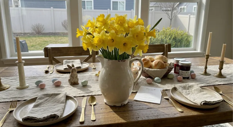 Bright yellow daffodils in a repurposed milk bottle or ceramic pitcher bring that cheerful Easter morning energy to any sideboard or brunch buffet table. Trim daffodil stems to 8 to 10 inches and cluster 6 to 8 stems tightly in a narrow-neck vintage bottle. Add 3 to 4 baby’s breath sprigs around the outer edge to soften the look and stretch the arrangement without adding cost.