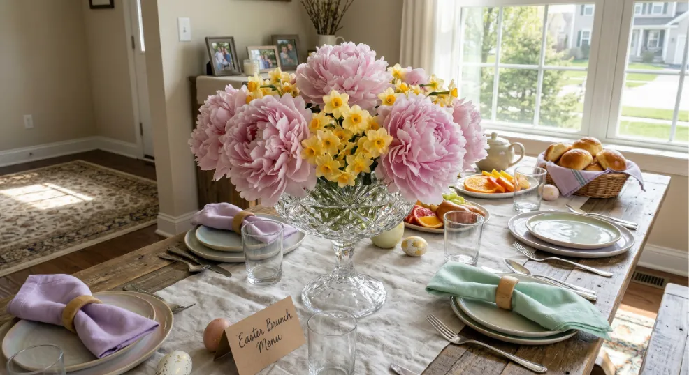 Combining peonies and daffodils in a footed glass compote dish creates a balanced, two-tone Easter centerpiece that looks far more expensive than it is. Fill the compote with 3 to 4 inches of water and place 4 peony stems around the outer edge. Tuck 5 to 6 daffodil stems into the center so their golden trumpets peek out from between the voluminous peony petals for striking color contrast.