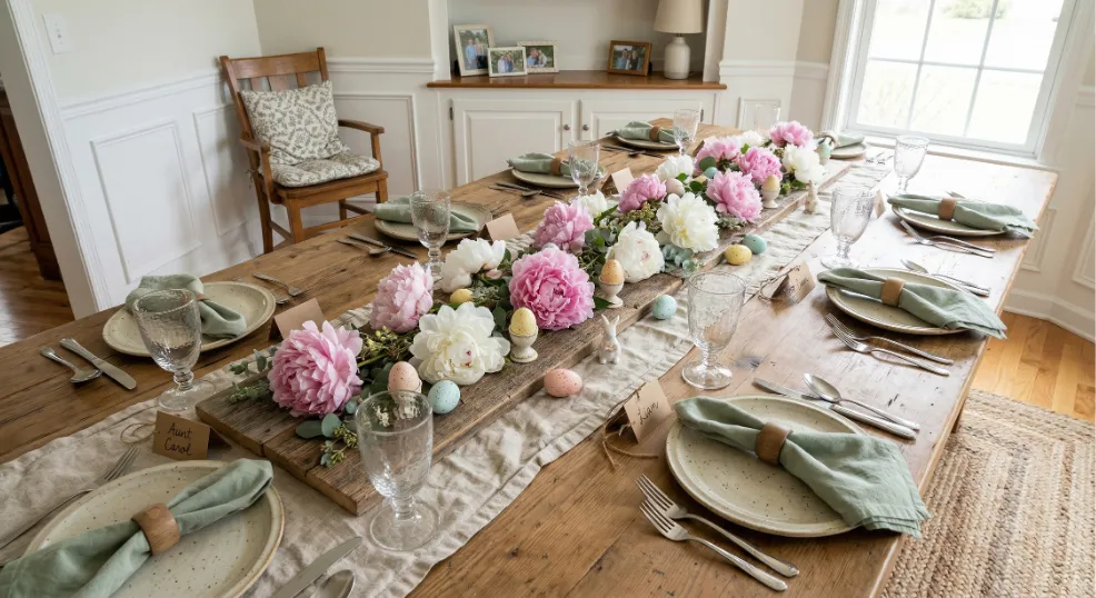 Scattering full peony blooms along a linen table runner over a reclaimed wood plank turns your Easter dining table into a magazine-worthy spread for almost nothing. Source a 24 to 36 inch piece of barnwood or an old fence plank and lay it flat down the center of your table. Arrange 8 to 10 peony heads at staggered angles directly on the linen runner, adding small foraged branches between blooms to fill gaps and reinforce the rustic spring look.