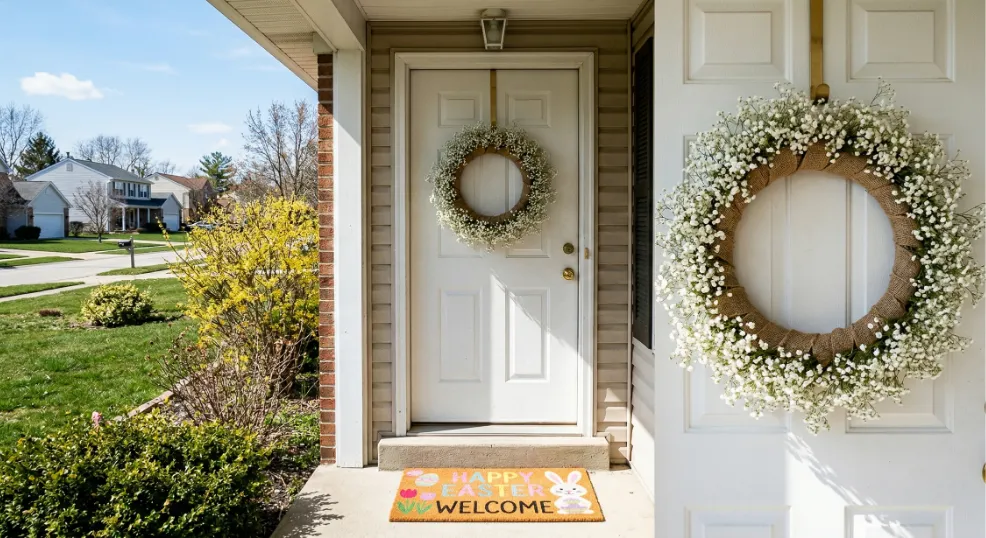 A baby’s breath wreath built on a dollar-store foam base delivers soft, cloud-like Easter cheer on doors or laid flat as a table centerpiece. Wrap a wire hoop or foam ring in a strip of burlap ribbon and secure with hot glue. Pin small clusters of baby’s breath evenly around the entire ring using floral pins until the base is fully covered and the wreath looks full and airy.