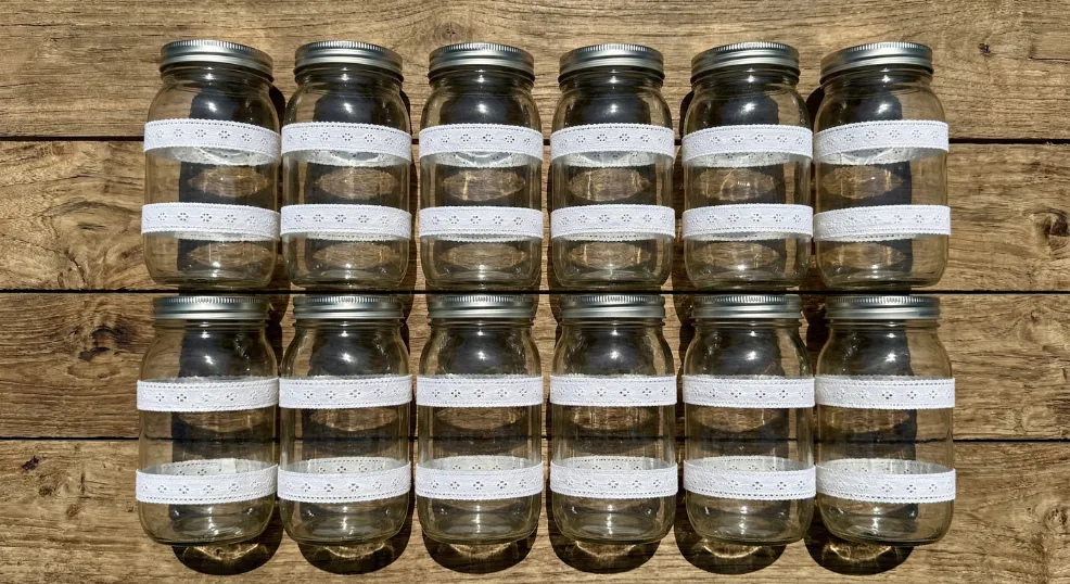 Stacking multiple narrow lace bands at measured intervals gives a jar an apothecary-inspired look that feels collected and intentional. This style works especially well for tall quart-size jars.