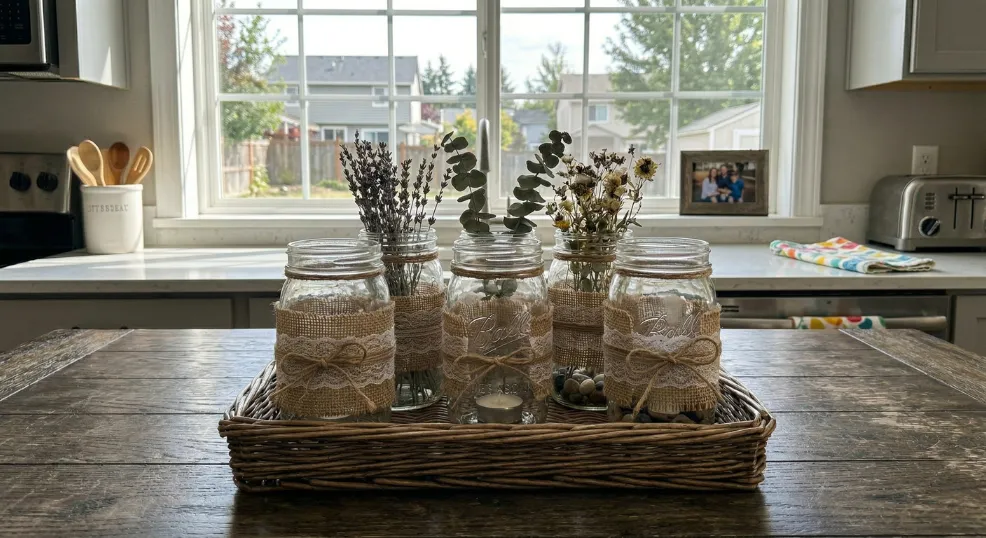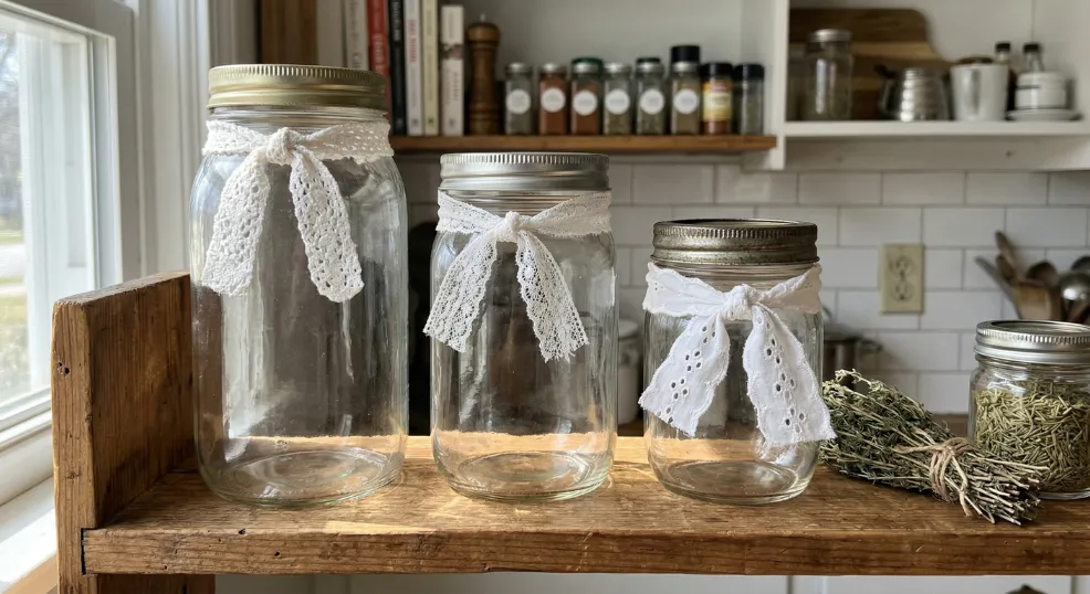 Removable lace wraps (secured with garment tape or a simple knot) mean a single set of jars can be restyled for Thanksgiving, Christmas, or a spring reset in minutes. It is an eco-friendly alternative to buying seasonal decorative containers.
