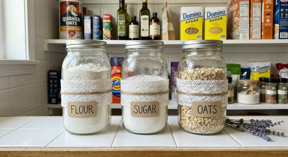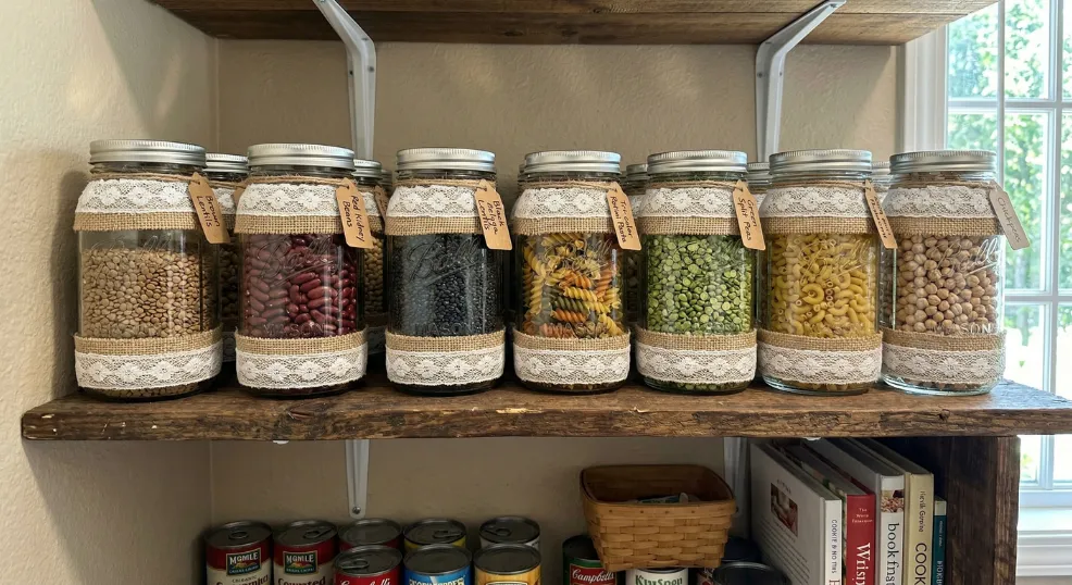 For households managing gluten-free, organic, or allergen-specific foods, this idea replaces plastic stickers with an elegant visual sorting system. Different shades of lace instantly tell family members which jar is which.
