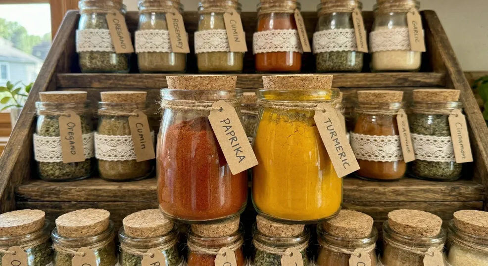 A cohesive spice rack is one of the easiest wins in any pantry refresh. Small 4 oz jars wrapped in delicate lace create a soft, unified look without hiding the colorful spices inside.