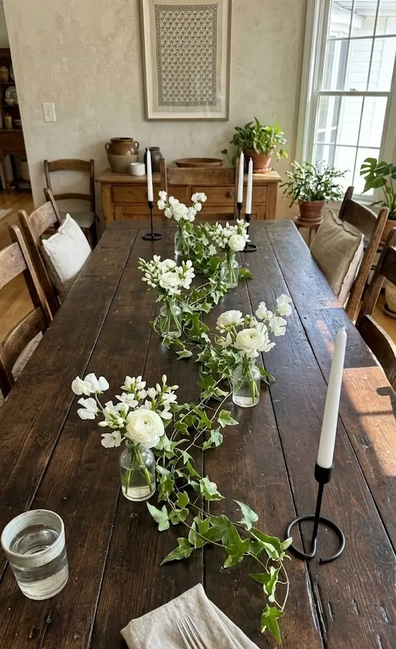 If your table is a long, narrow rectangle (think apartment nook tables or console tables converted for dining), this layout turns that challenge into a feature. You follow the long axis of the table with a staggered line of tiny bud vases, keeping the total width to just 4 to 5 inches.