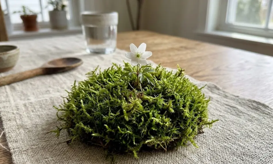 Lay a waterproof runner down the center of your table first. Place flat pillows of Mood Moss or Sheet Moss directly onto the runner, then tuck small bloom tubes (water picks) into the moss to hold 2 to 3 focal flowers per mound.