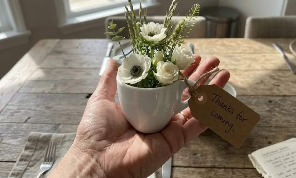 Keep the finished favor no larger than 4 by 4 inches so it fits comfortably in a tote bag or purse. Tie a small “Thanks for coming” tag to the handle of the cup to complete the look.