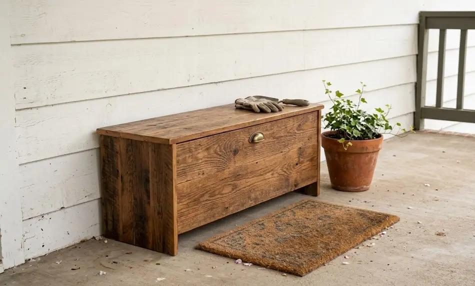 A flush, built-in style bench made from weather-treated reclaimed wood gives you a place to sit and hides your spring clutter — umbrellas, garden gloves, muddy tools — inside a lift-top compartment. It hugs the wall, it doesn’t jut into the walkway, and it looks like you hired a designer.