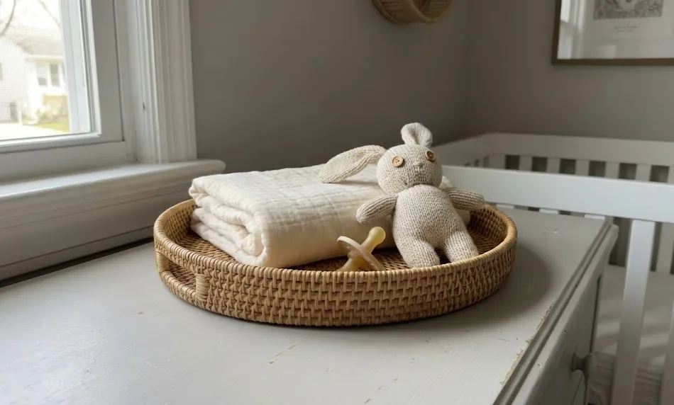 Container idea: a natural seagrass or woven water hyacinth basket with a handle. It converts into a toy storage bin or pantry basket after the baby grows out of mealtime gear — that heirloom durability is exactly what separates this from a throwaway gift.
