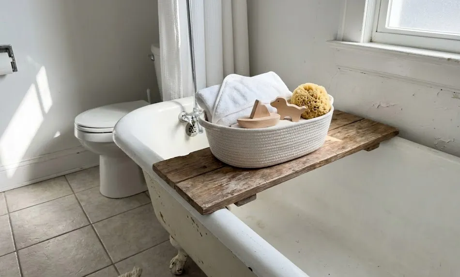 Budget range: $40–$75. Bath time is where plastic usually dominates — squeezy toys, plastic cups, synthetic-fiber washcloths. This theme flips all of that.