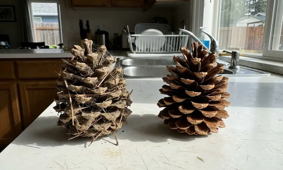 Does vinegar remove sap from pine cones? Partially. The acid softens fresh, tacky sap so it rinses away during the air-dry phase, but thick, hardened resin (especially on sugar pines) needs extra help.